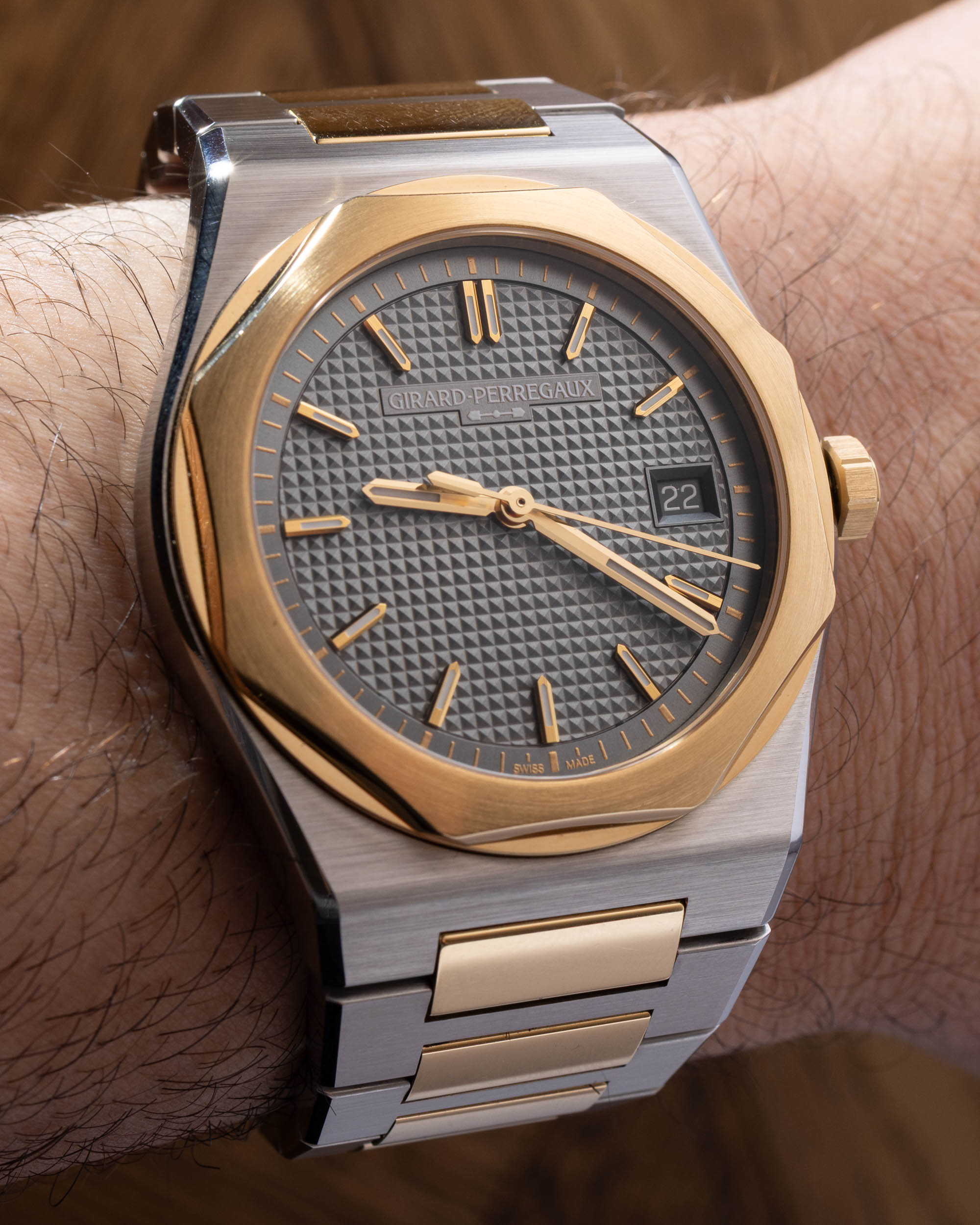Its two-tone design - stainless steel and 18k yellow gold - pays tribute to the original 1970s Laureato aesthetic, but in a sleeker, more refined form. The octagonal bezel gleams against a satin-finished case, and the grey dial brings a contemporary sophistication. The “GP” logo has been replaced with a double-stick index at 12 o’clock, balancing the symmetry and cleaning up the dial layout. The overall impression is one of quiet confidence - luxury that doesn’t need to shout.