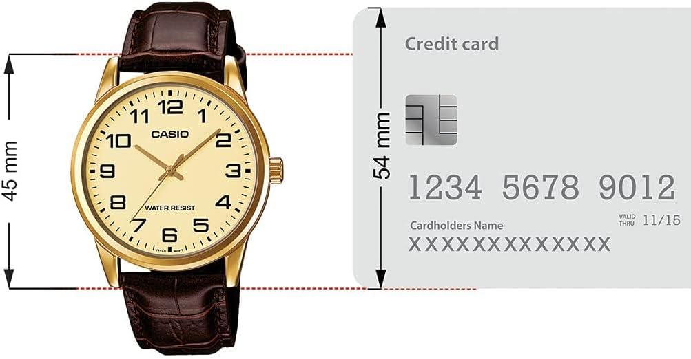 The watch boasts a genuine leather band in a rich brown hue, providing comfort and a secure fit with its standard men’s size and buckle clasp. The gold-colored dial adds a touch of opulence, complemented by the watch’s analog display which offers easy readability. Despite its elegant appearance, this Casio watch is built for reliability and convenience. It features a precise quartz movement, ensuring accurate timekeeping, and is water resistant up to 30 meters, making it suitable for everyday wear and minor water exposure.