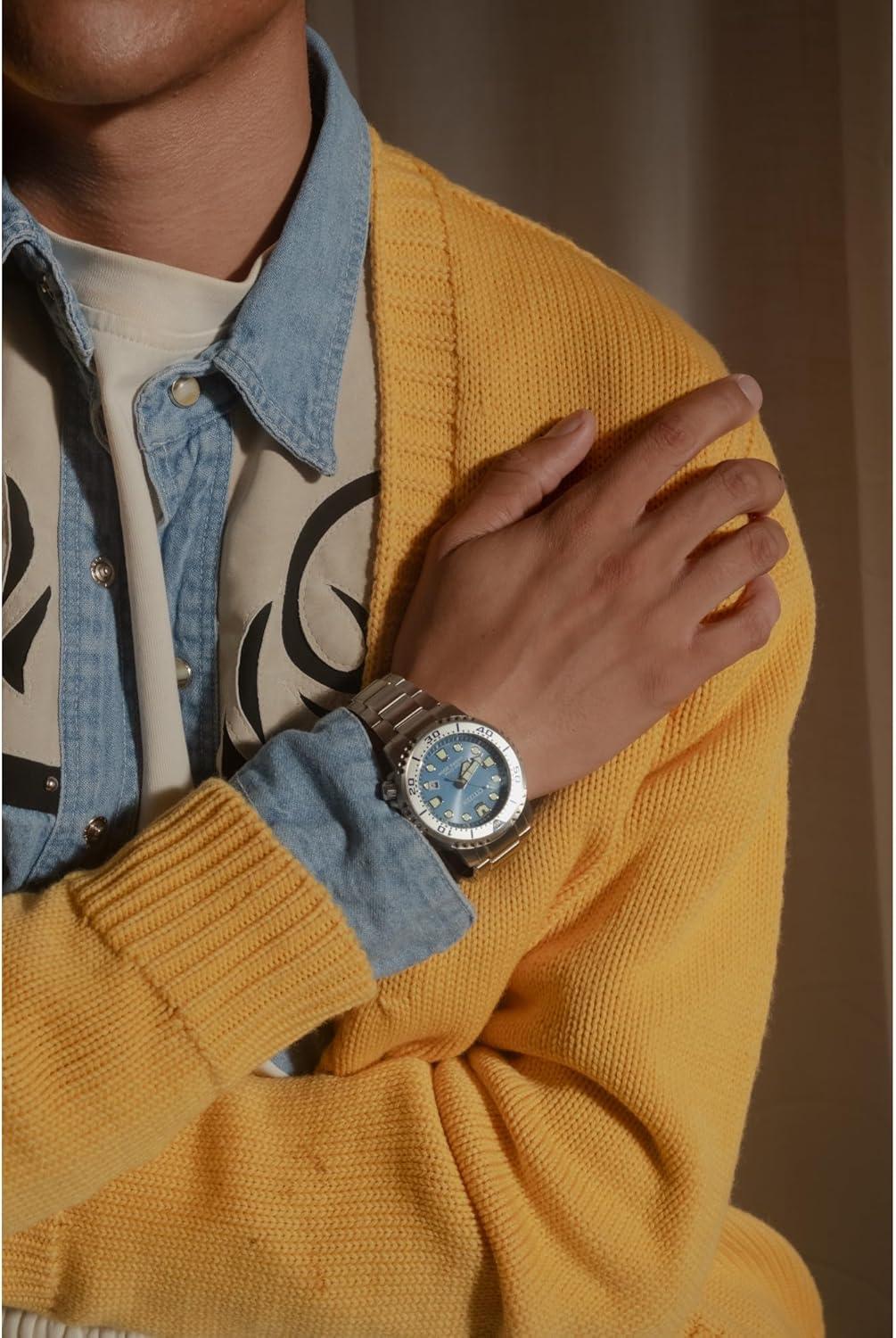 The sunray-textured light blue dial is not only visually striking but also highly practical. Oversized hands and applied markers ensure exceptional legibility, which is further enhanced by luminous accents that illuminate even the deepest underwater explorations. A thoughtfully placed date window at the 4 o’clock position adds a layer of convenience, keeping you organized and timely.