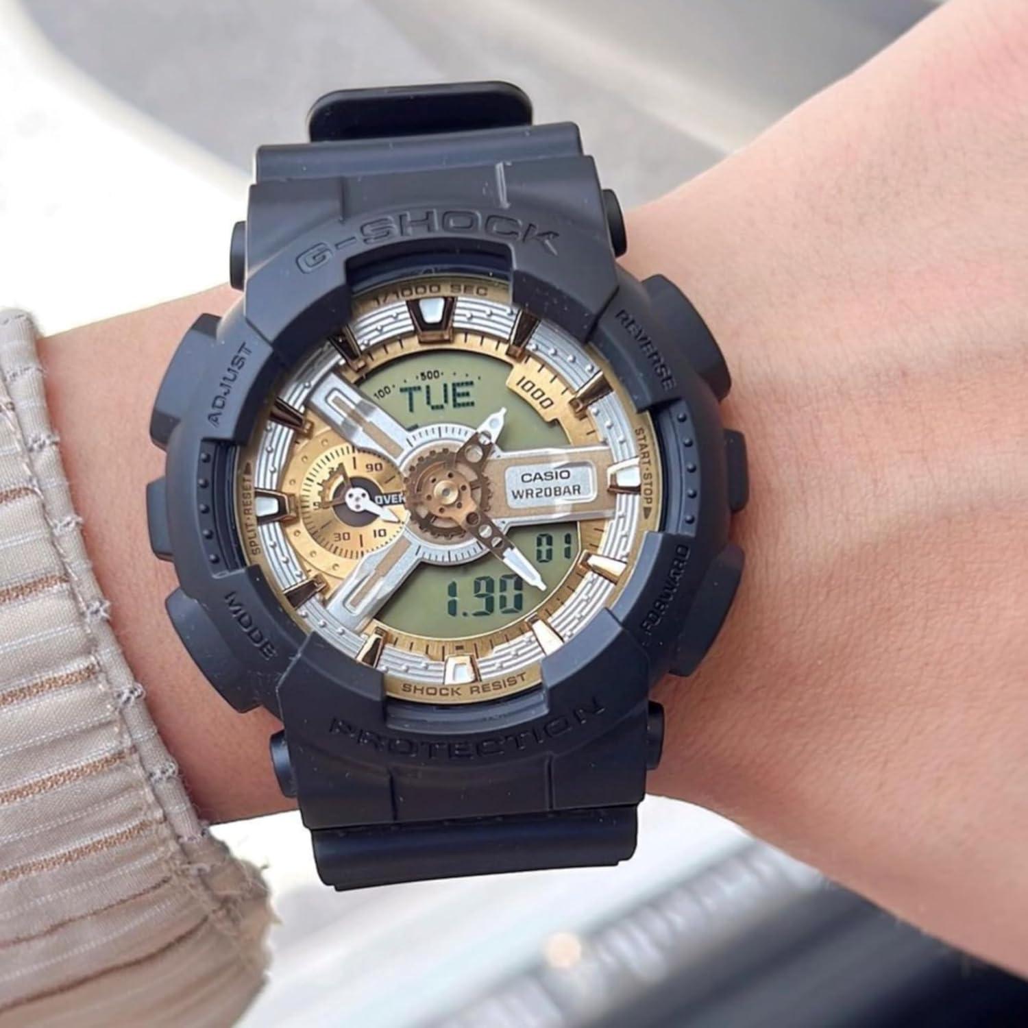 Introducing the G-Shock GA-110CD-1A9CR Analog/Digital Watch, the ultimate timepiece for those who demand style and functionality. This watch is not just a timekeeper, but a statement of boldness and durability. With a large case design, it offers a solid presence on your wrist, making it an ideal accessory for both casual and formal occasions. The luxurious dual-tone dial featuring striking gold and silver accents against a sleek black band adds a stylish pop to your look, ensuring you stand out from the crowd.