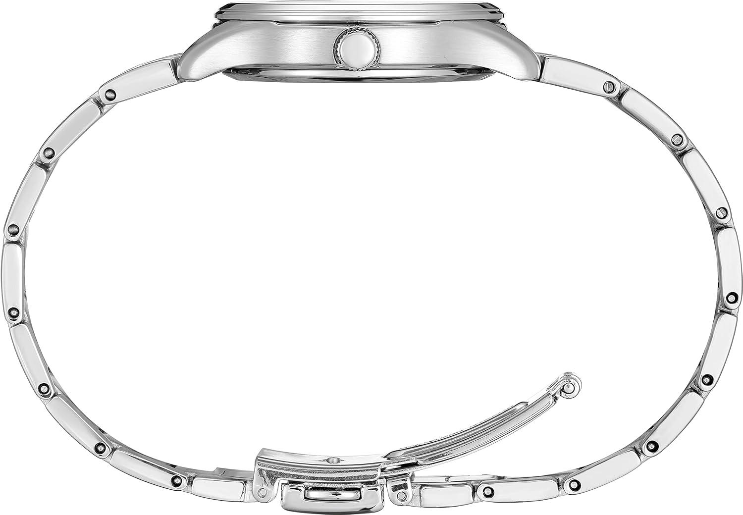 The captivating blue dial is protected by a robust crystal dial window, providing clarity and resilience against scratches. The analog display is accentuated by Arabic numerals, offering a classic look that is easy to read at a glance. The deployment clasp secures the stainless steel band, which is designed to fit a standard women’s wrist, offering both style and comfort.
