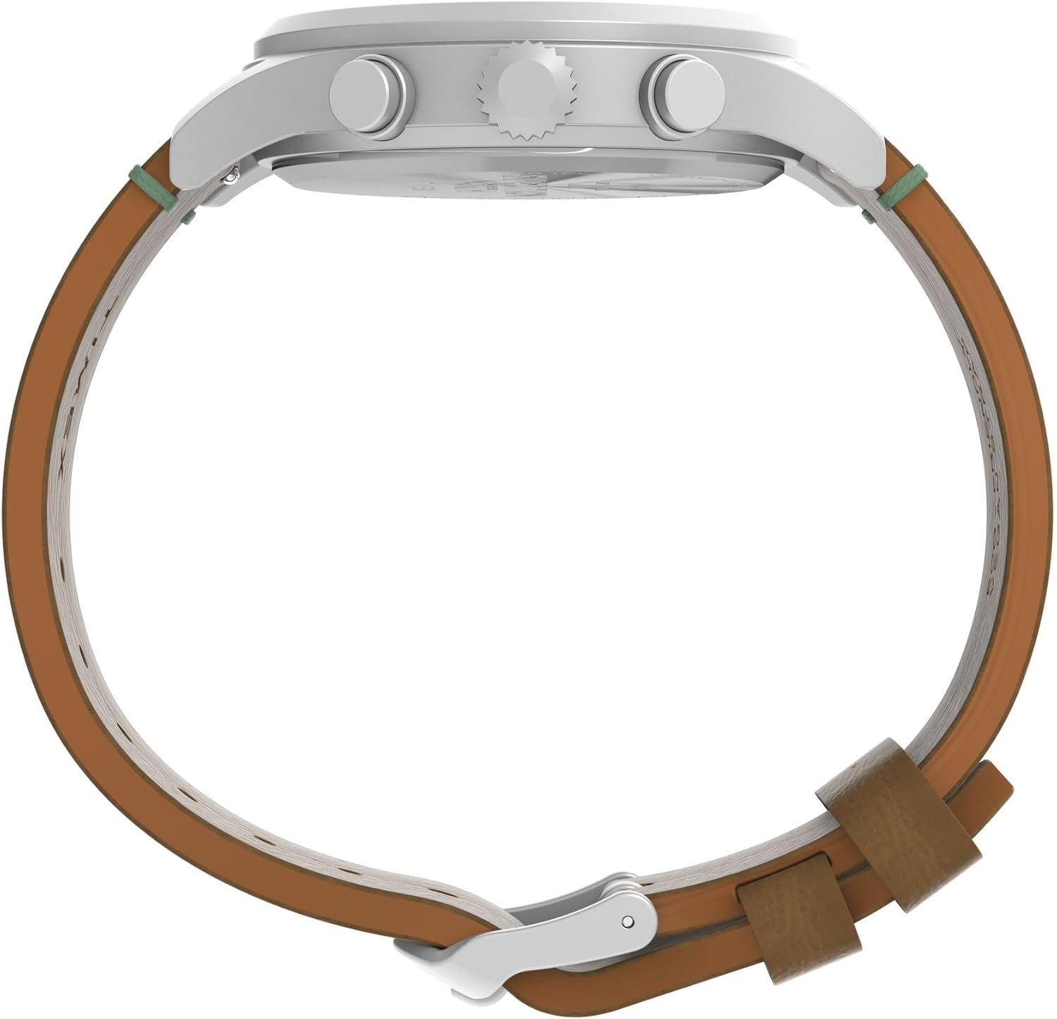 One of the standout features of this watch is its chronograph functionality, allowing you to measure elapsed time with ease, whether you’re timing a race or your morning jog. The dial is protected by a mineral glass window, offering scratch resistance and durability. The watch’s design is further enhanced by a brown eco-friendly leather strap, crafted from vegan materials for a sustainable choice. This strap not only offers comfort but also features a quick-release mechanism, allowing for effortless strap changes without the need for tools.