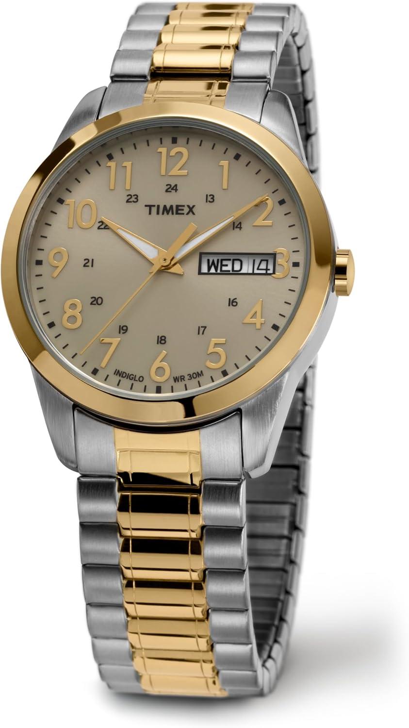 Introducing the Timex Men’s TW2P67400 South Street Sport Two-Tone/Champagne Extra Long Stainless Steel Expansion Band Watch, a perfect blend of classic elegance and modern functionality. Crafted with precision, this timepiece is designed for the discerning gentleman who appreciates both style and performance. The watch features a sophisticated two-tone 18mm stainless steel expansion band that comfortably fits a wrist circumference of up to 8.25 inches, ensuring a secure and stylish fit. The champagne dial, adorned with full Arabic numerals and a day-date window at the 3 o’clock position, offers a touch of luxury and practicality.